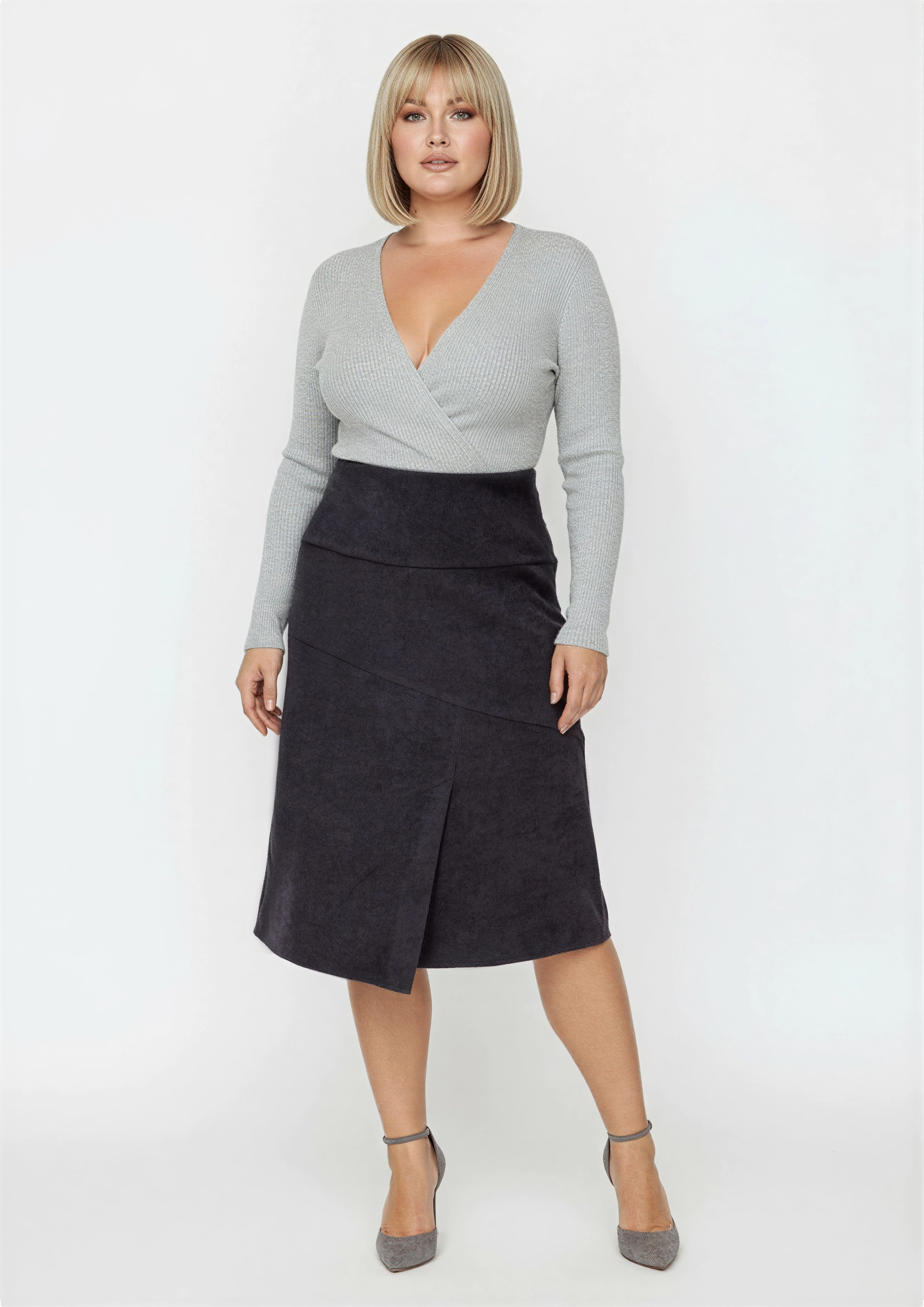 Юбка из вельвет трапециевидного-силуэта, на передней части асимметричная шлица. Поперечные, косые подрезы украшают юбку.