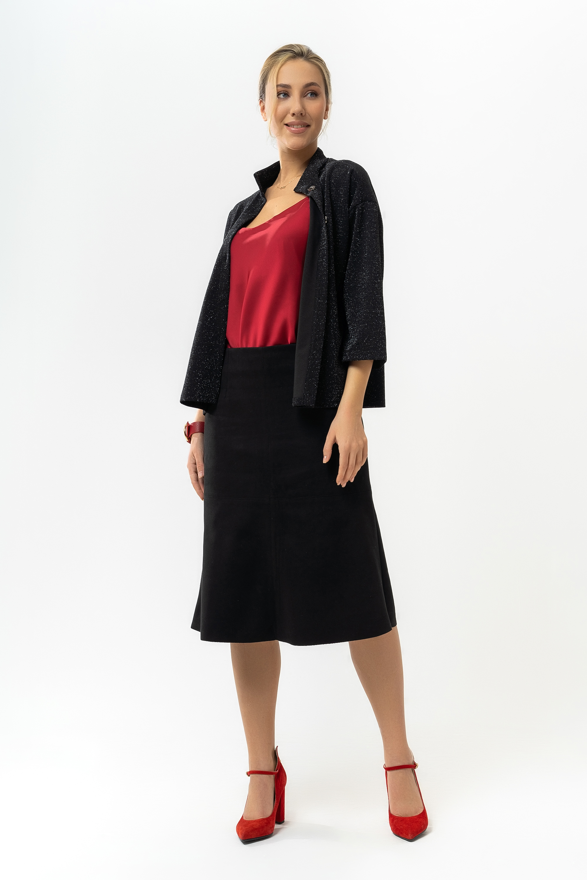 Юбка замшевая трапециевидного-силуэта, с застежкой на молнию. Юбка отстрочена по поперечным и долевым швам.